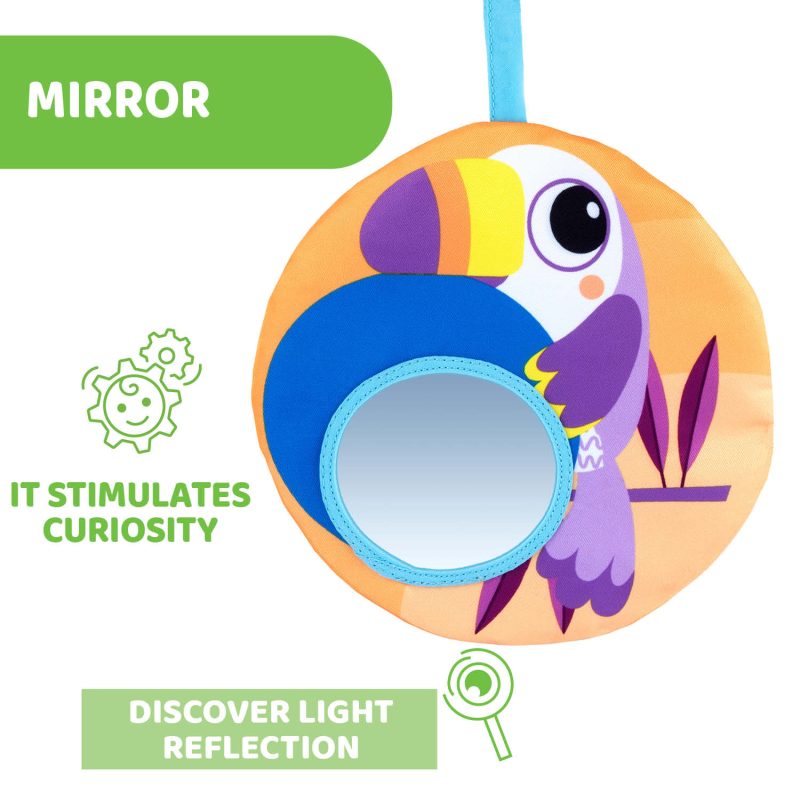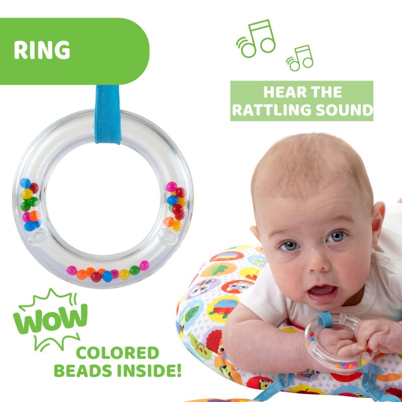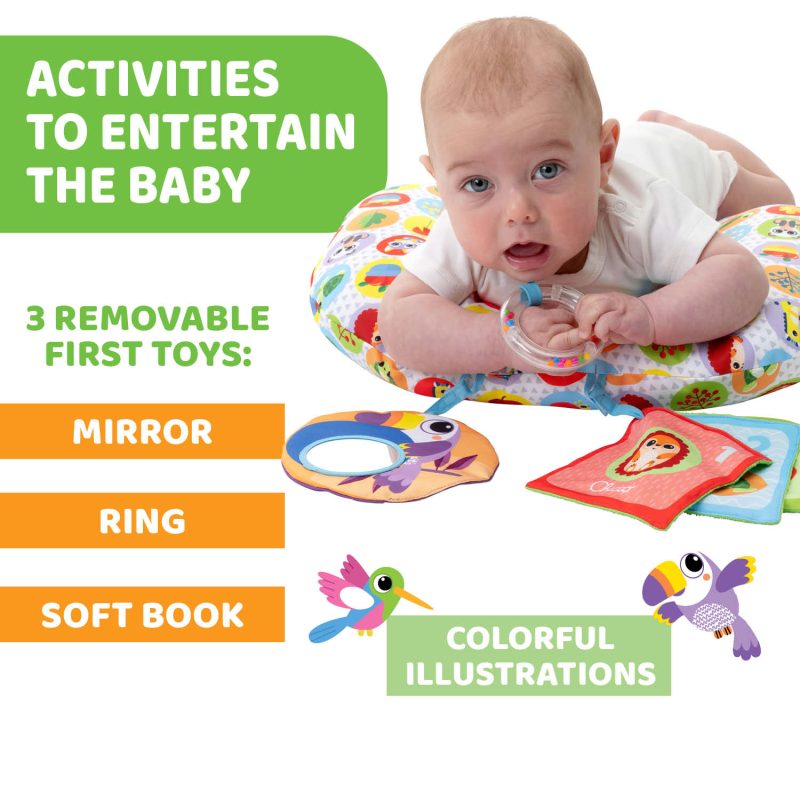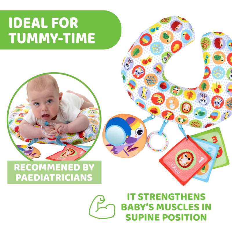 Tummy time púðinn er mjúkur og litríkur púði með skemmtilegum leikföngum sem fest eru í púðann og auðvelt er fyrir börnin að ná í.