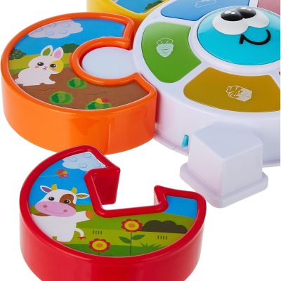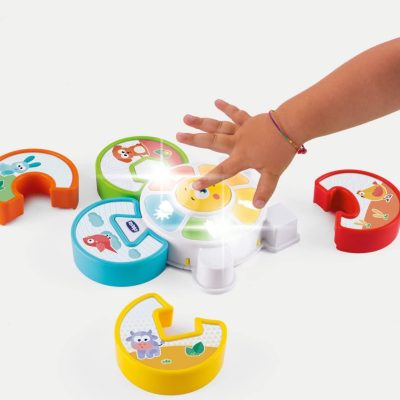 Þegar barnið setur rétta púsl þar sem ljósið blikkar heyrist hljóðið sem dýrið segir.