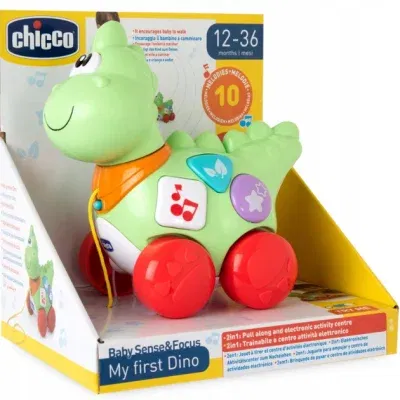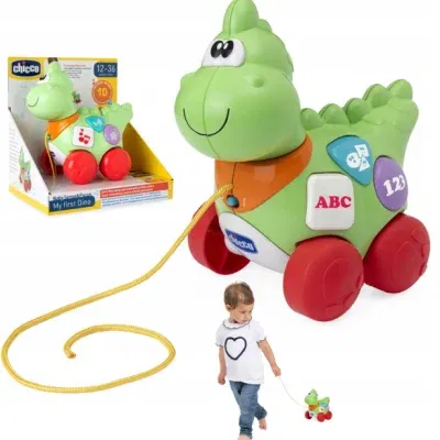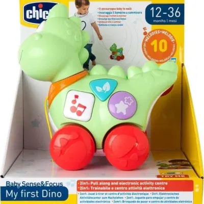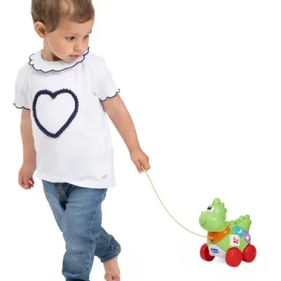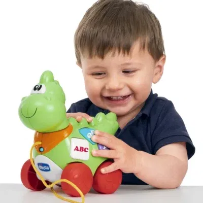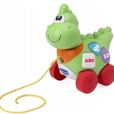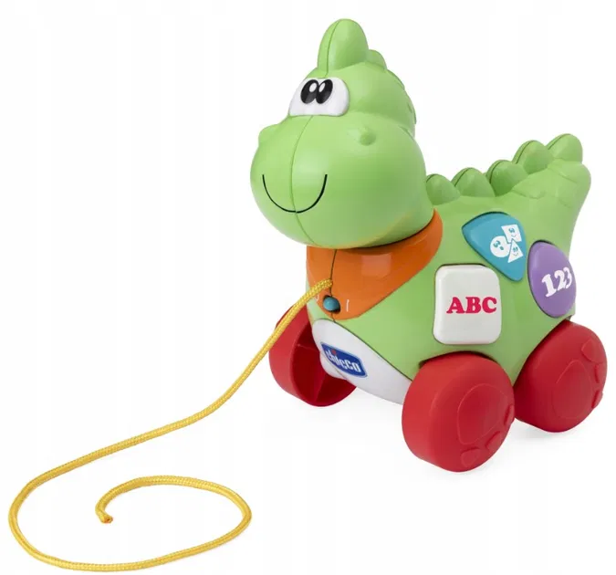 Risaeðlan gefur frá sér skemmtileg hljóð og laglínur og höfuðið sveiflast til hægri og vinstri þegar hún er dregin áfram
