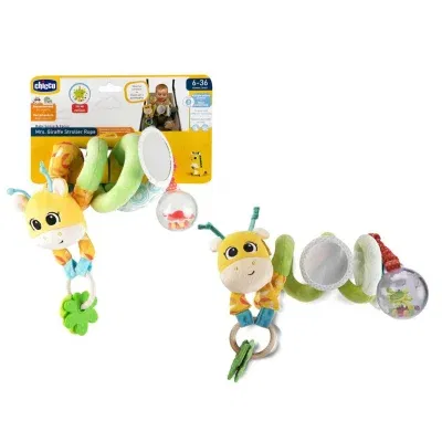 Þessi fallegi leikfangagíraffi er með spegli, mjúkum plasthringjum sem barnið getur bitið í og gegnsætti plastkúlu á endanum með litlum hljóðkúlum inní.
