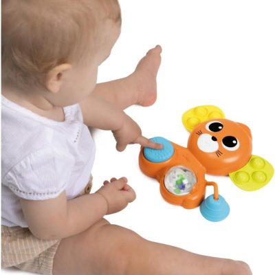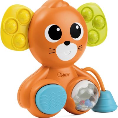 „Pop-up“ silicone eyrun gefa fyndin og skemmtileg hljóð. Togaðu í skottið, hlustaðu á tístandi hljóðið úr loppunni og horfðu á litríku perlurnar inni í boltanum. Leikfangið er létt og nett og hægt að taka það með sér hvert sem er – líka á ferðalögum. Bakið er flatt, sem gerir það kleift að setja það á gólfið eða flatt yfirborð. Leikfangið er sérstaklega högg- og fallþolið og allar brúnir eru ávalar og mjúklega mótaðar til að tryggja hámarksöryggi og fullkomna leikupplifun. Hentar frá 6 -36 mánaða