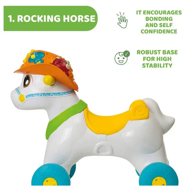 Ýttu á takkana sem eru á hattinum og hesturinn spilar tónlist og gefur frá sér hljóð.