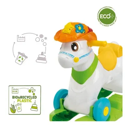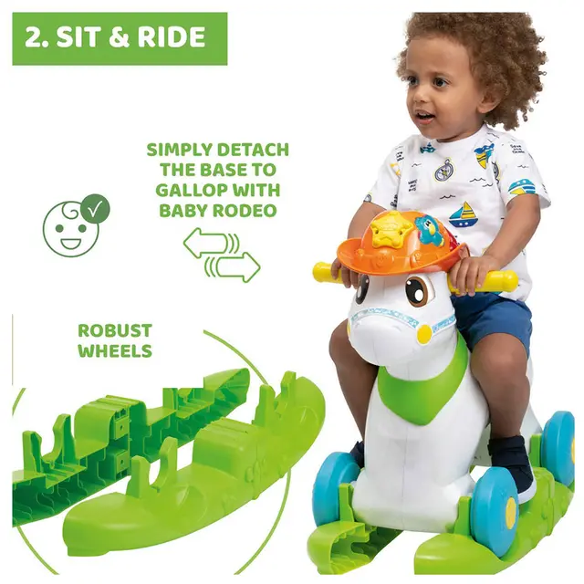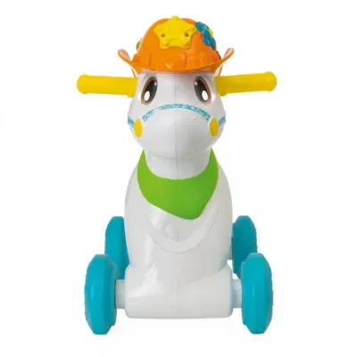 Með því að fjarlægja ruggubátinn er hægt að breyta hestinum í sparkhjól á fjórum hjólum.