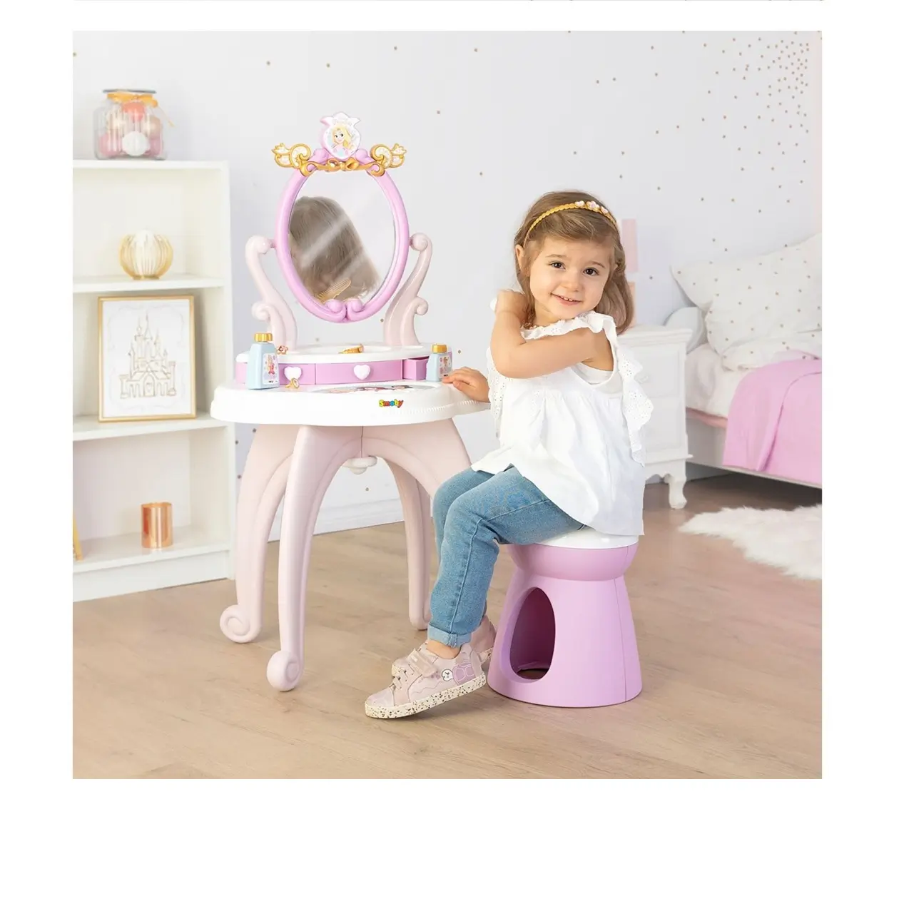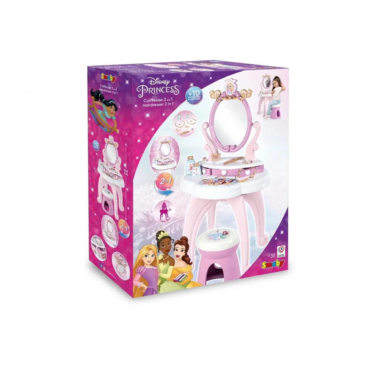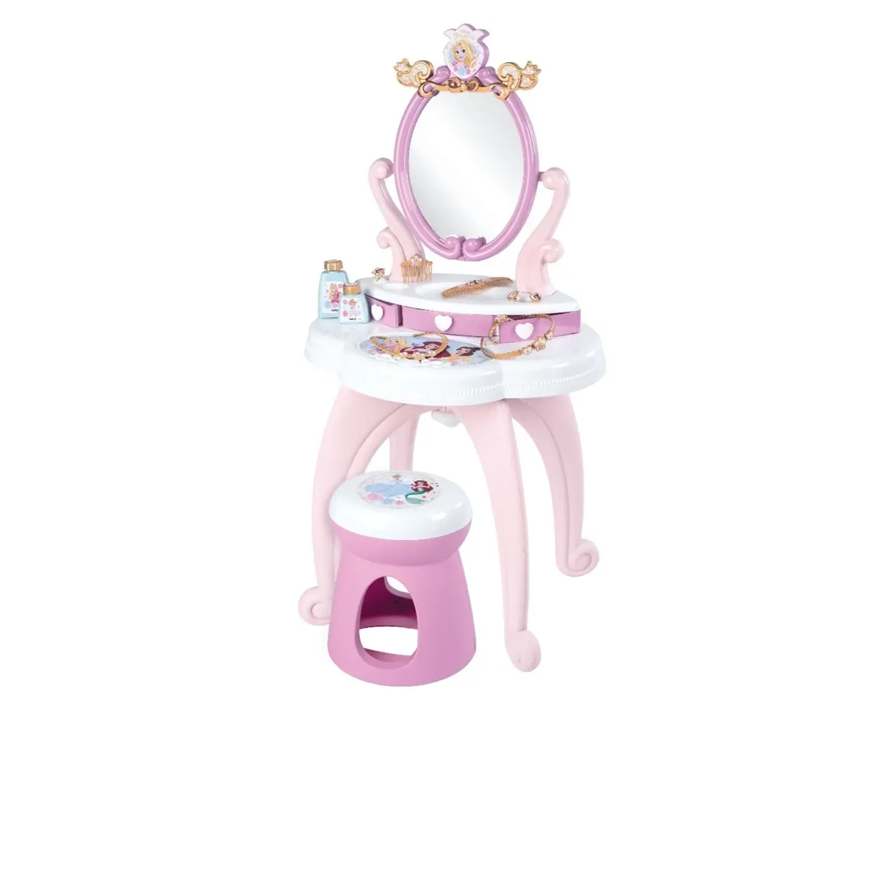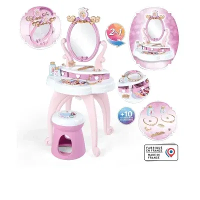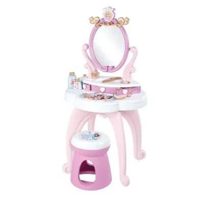 Leyfðu barninu þínu að stíga inn í ævintýraheim Disney prinsessanna með glæsilega SMOBY Disney Princess snyrtiborðinu! Þetta fallega borð er fullkomið fyrir öll börn sem elska að klæða sig upp, spegla sig og leika ímyndunarleik með snyrtivörum, skarti og hárgreiðslu.