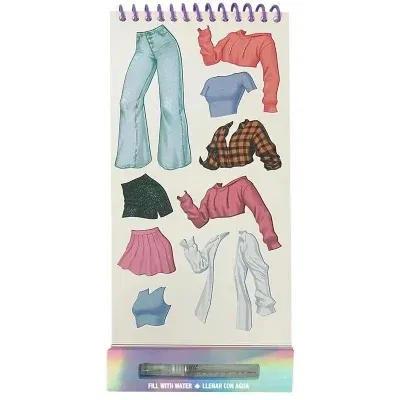 Litaðu fötin með því að spreyja þau með vatni og límir þau svo á dúkkulísurnar. Hægt að nota límmiðana aftur og skipta um föt á dúkkunum.