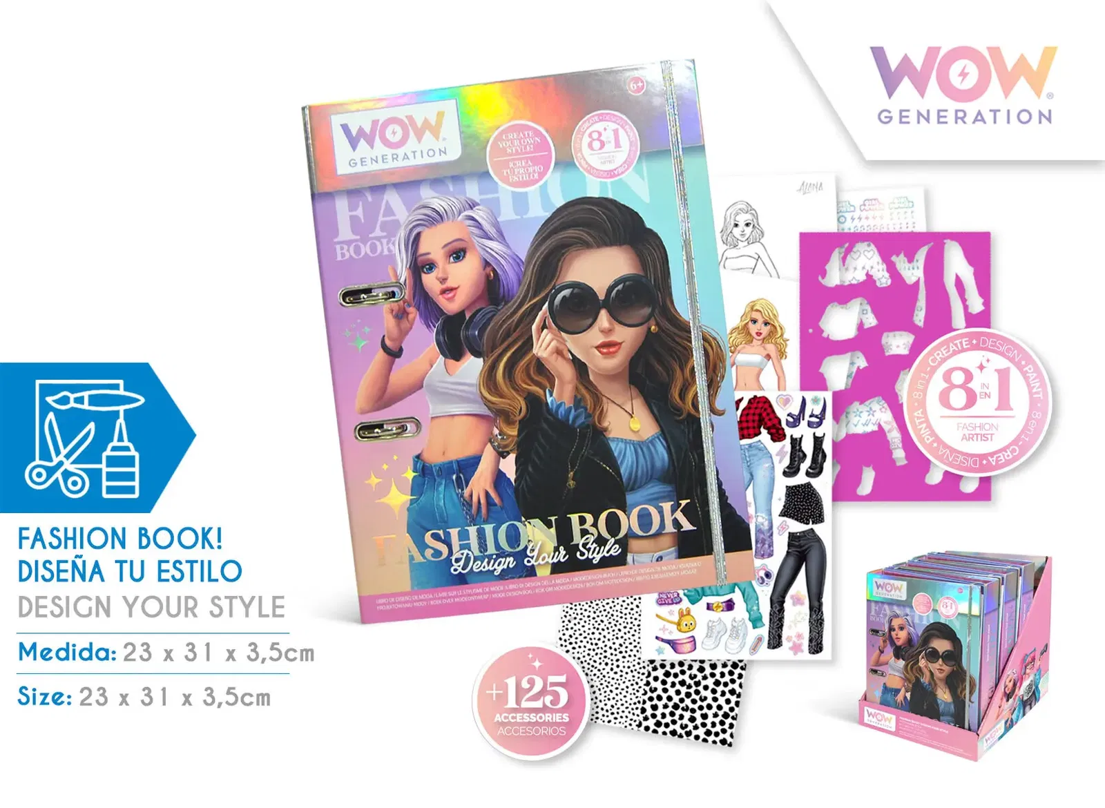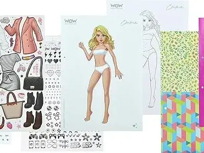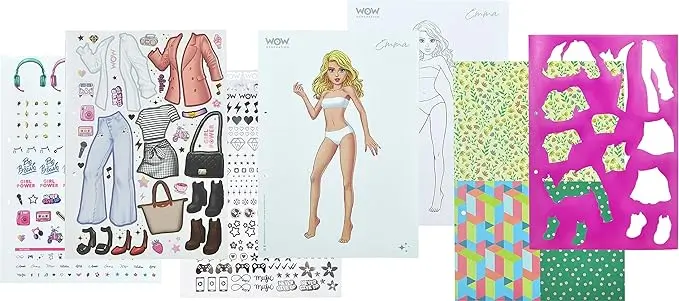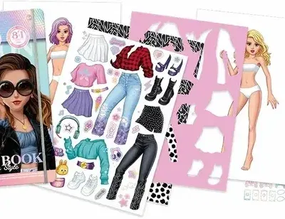 Skemmtileg bók með límmiðum, dúkkulísum, stenslum og mismunandi blöðum til að hanna þína eigin tísku.