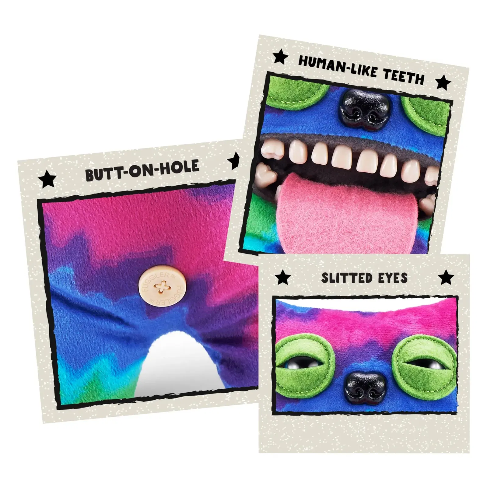Fuggler bangsarir eru með „button-hole“ að aftan og gervi-tennur.