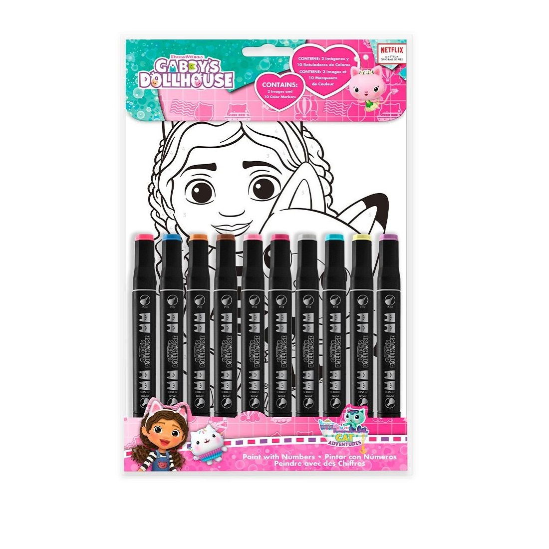 Með 10 tússlitum og 2 myndum af Gabby´s Dollhouse til að lita