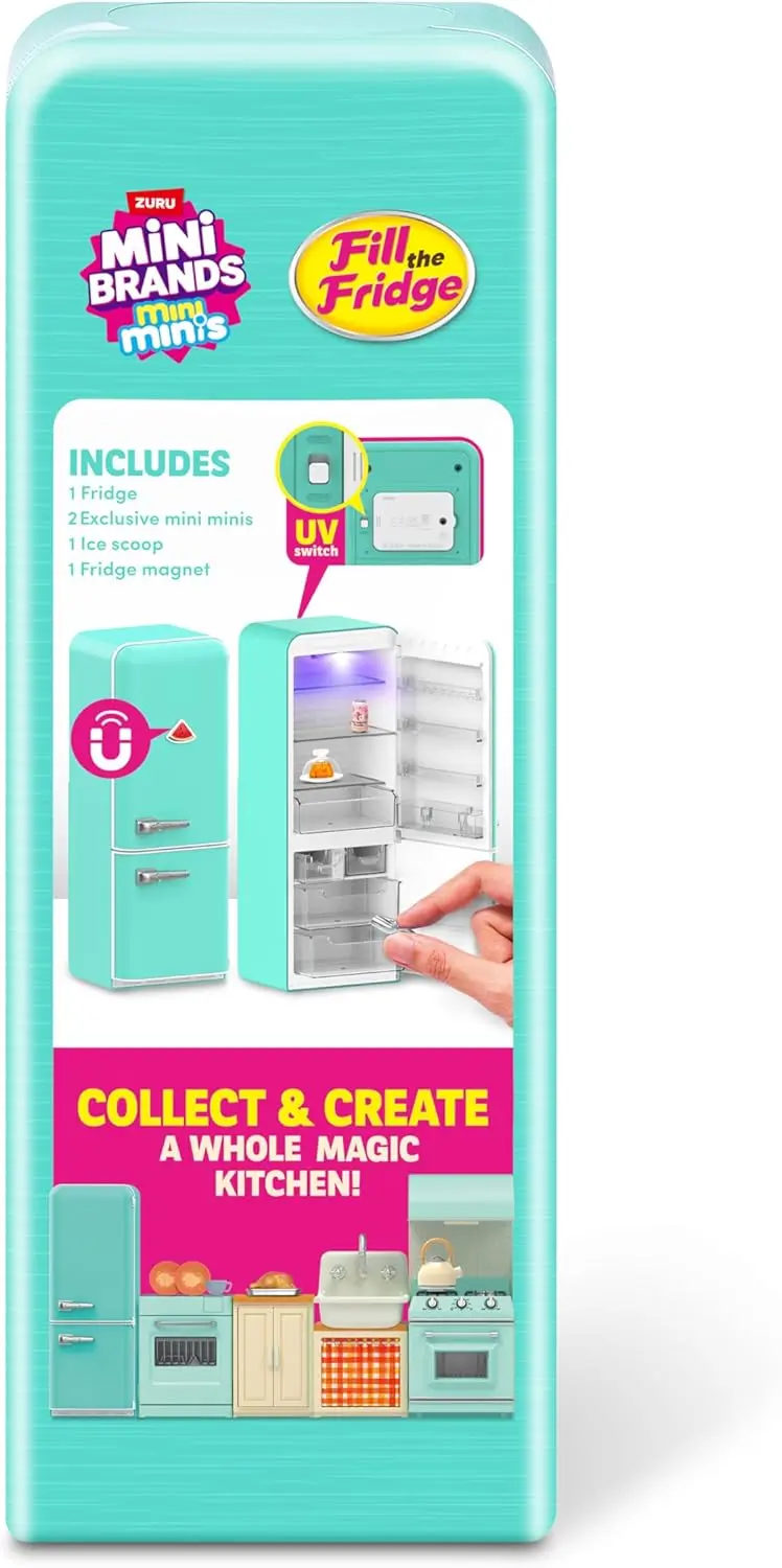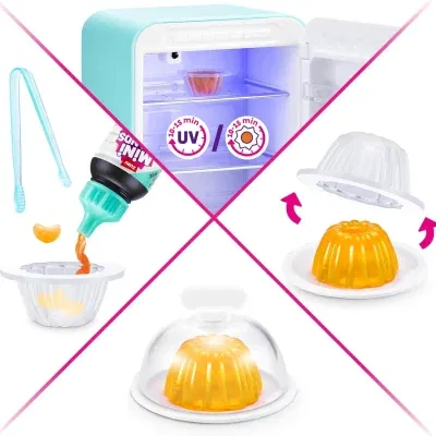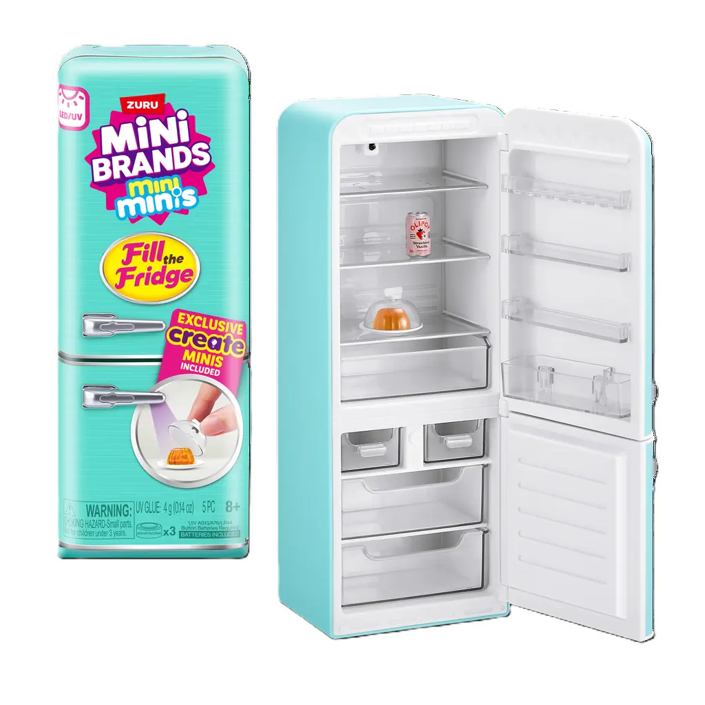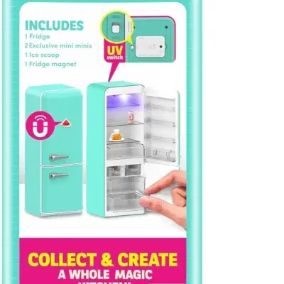 Flottur ísskápur með skúffum sem hægt er að opna og loka, UV ljósi og segul.  Með fylgja 4 einstaka mini vörur en einnig er hægt að kaupa sérstaka mini brands bolta til að fylla á ísskápinnn.