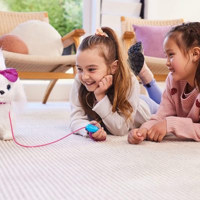 Pets Alive nýi hundurinn sem labbar. Hvítur, loðinn og með falleg blá glimmer augu. Með bleika glimmer slaufu og bleika ól