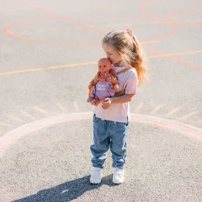 Barnið getur nú tekið dúkkuna sína með hvert sem er með burðarpoka framaná sér og með báðar hendur lausar á meðan.