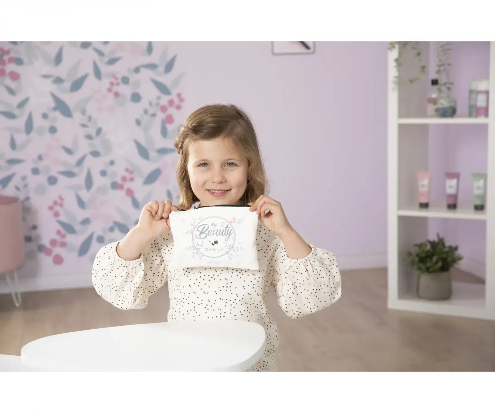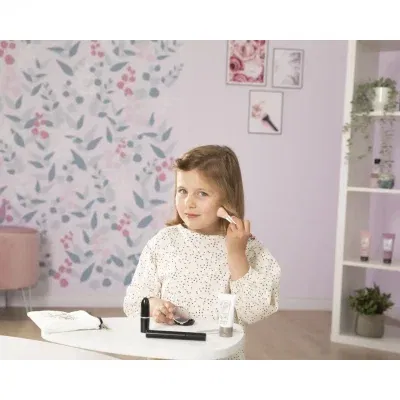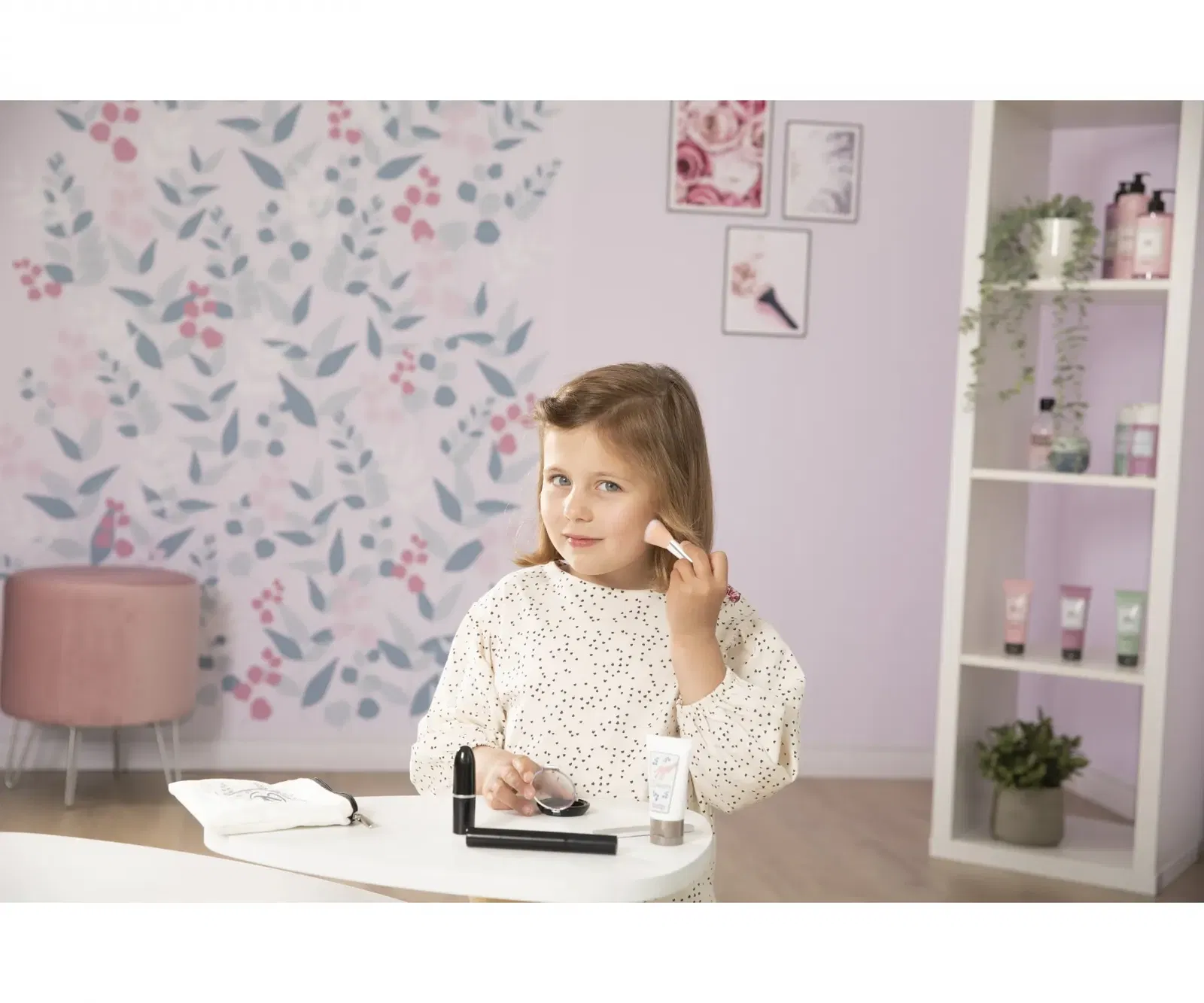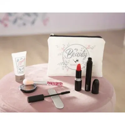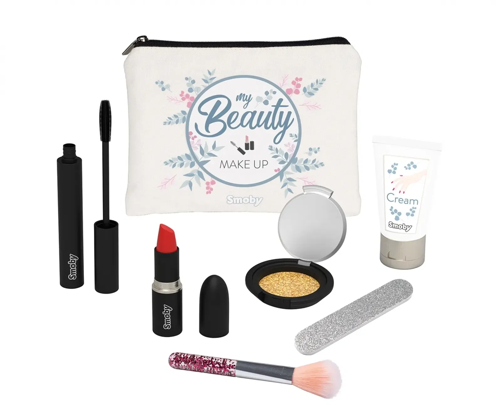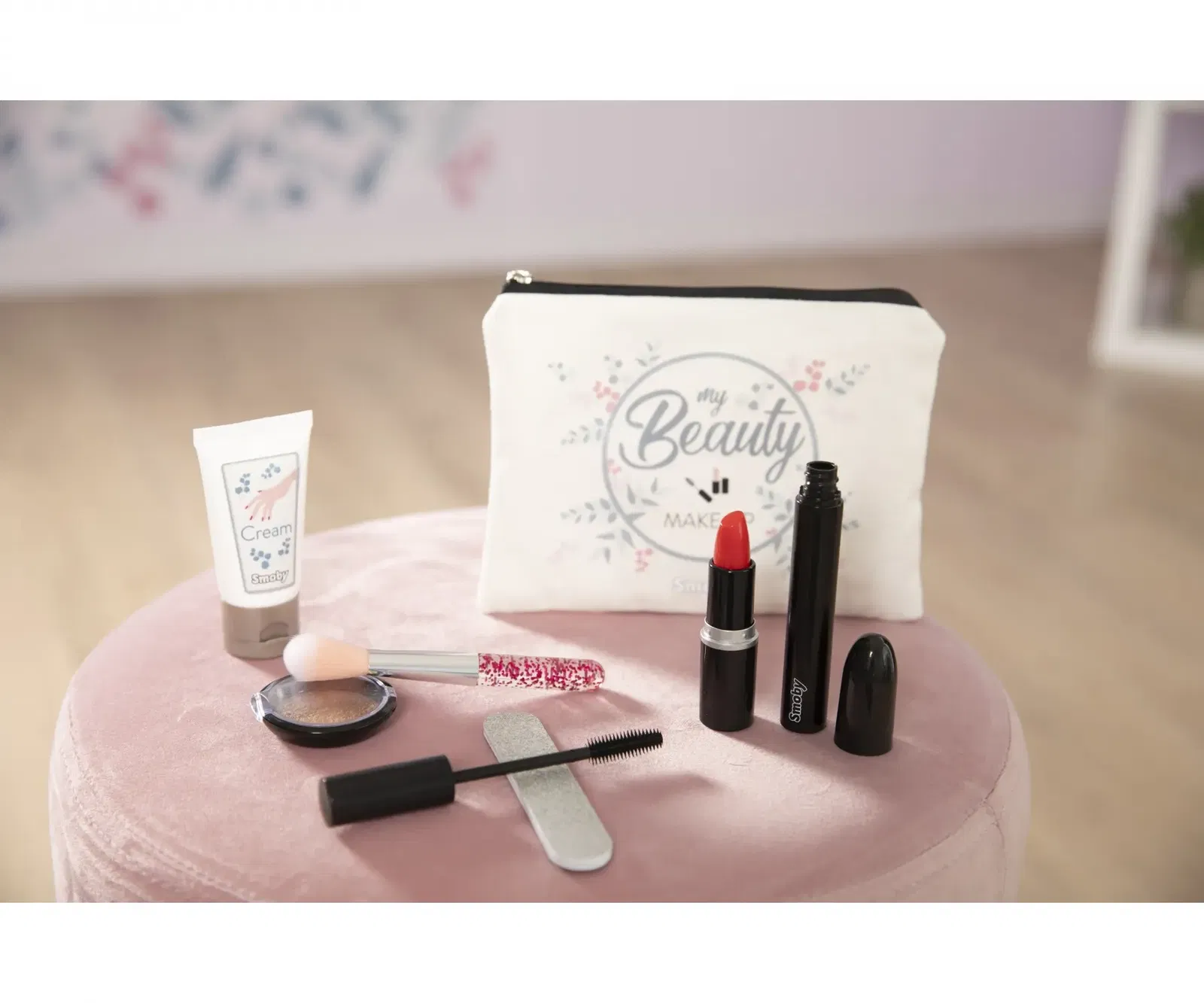 Snyrtivörurnar sem eru ekki alvöru eru : 1 maskari, 1 förðunarbursti, 1 naglaþjöl, 1 varalitur, 1 augnskuggi og 1 handáburður.