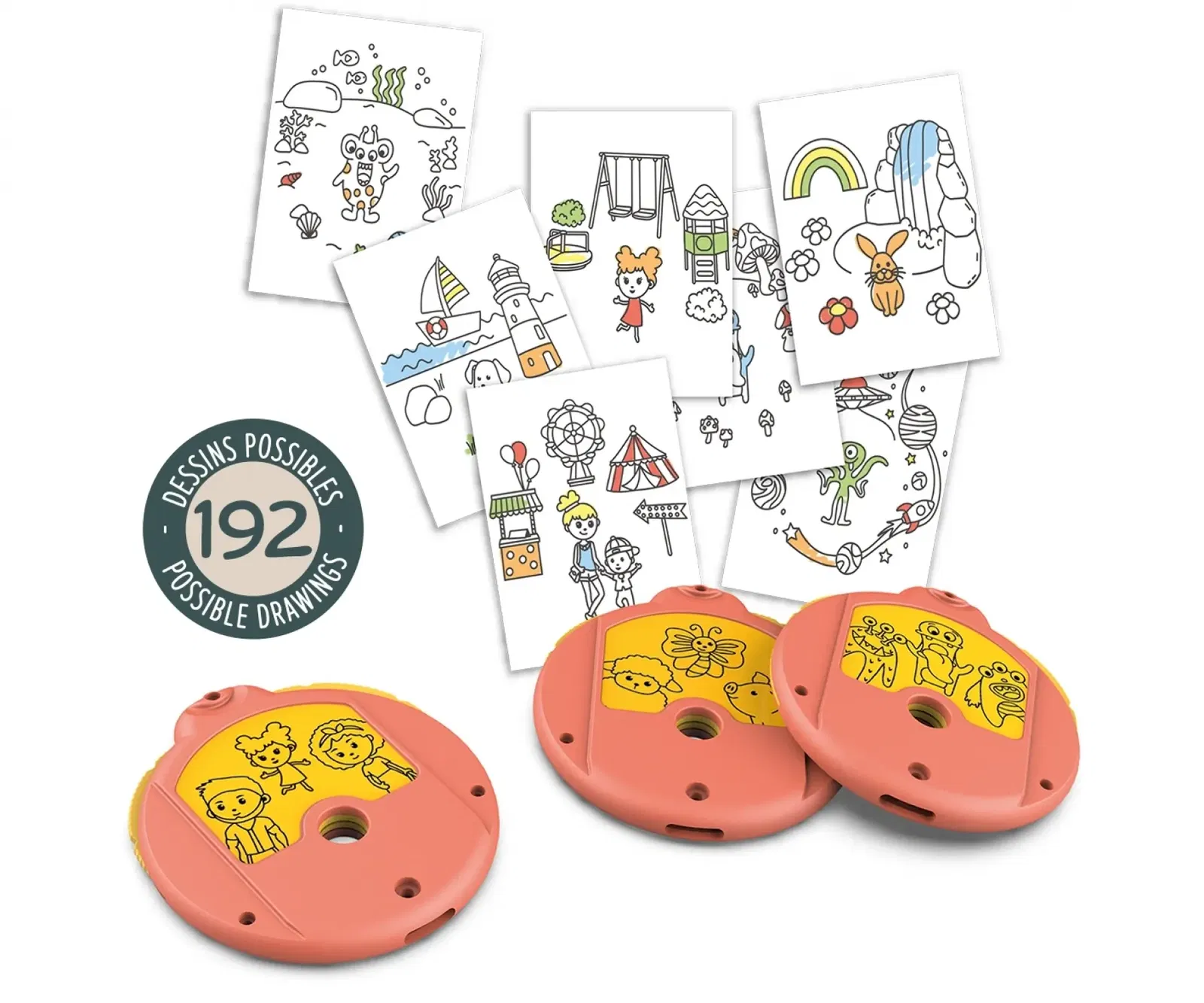 Settið inniheldur 3 mynda kassetur með mismunandi þemum – dýr, persónur og fleira – sem hægt er að blanda saman til að búa til allt að 192 mismunandi myndir til að teikna.