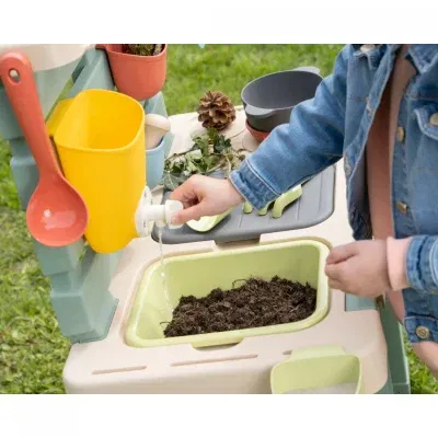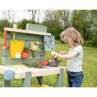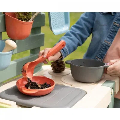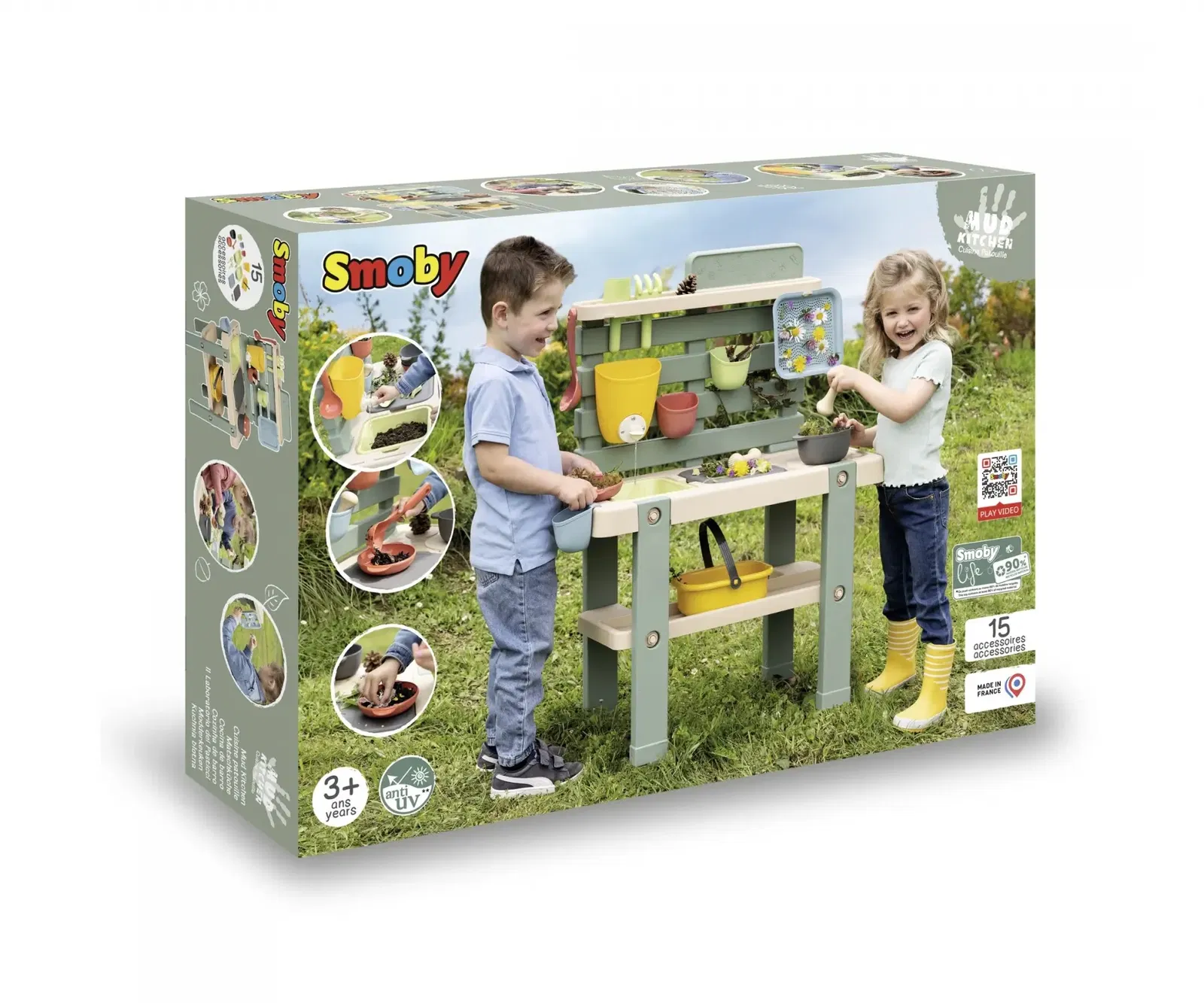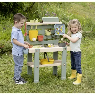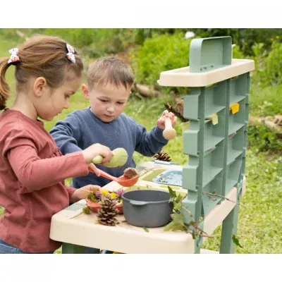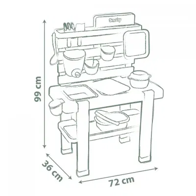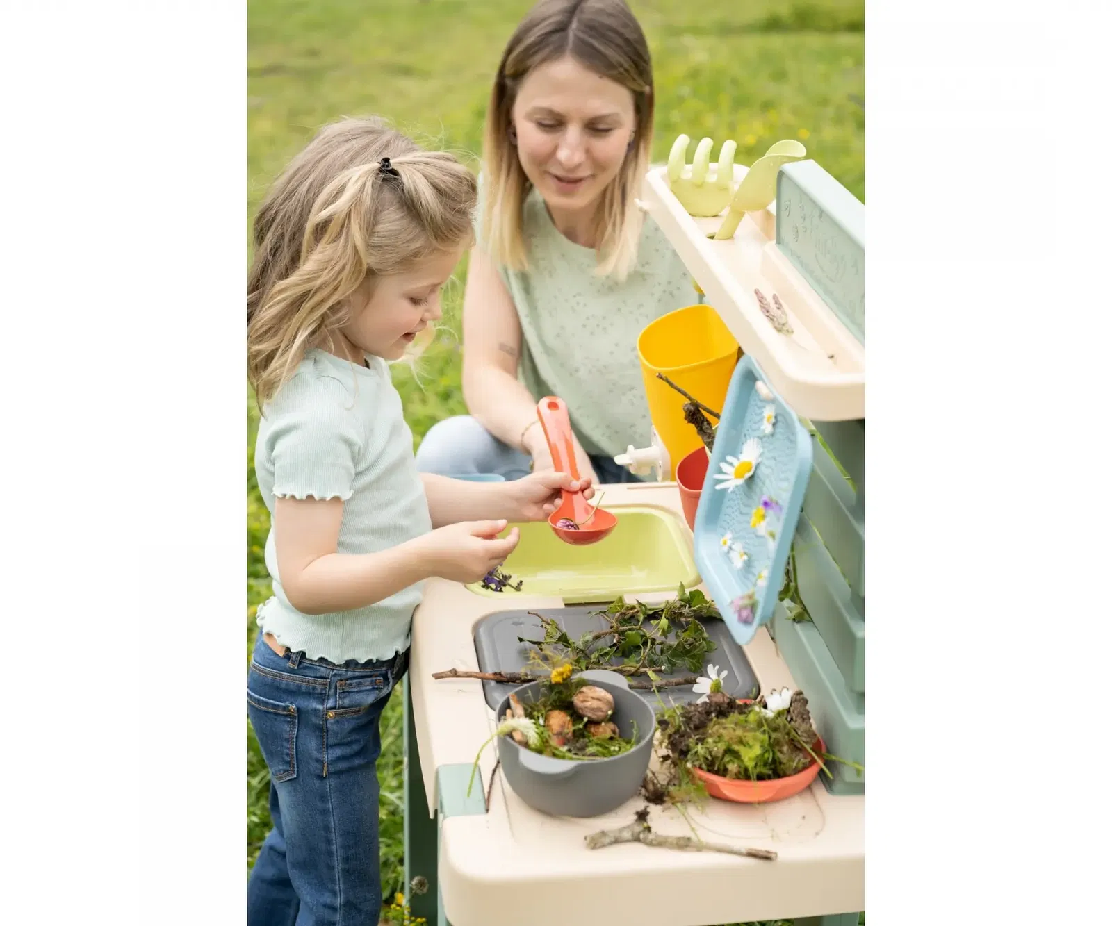 2 stórir færanlegir bakkar og áhöldin eru stærri en í venjulegi eldhúsi til að það sé auðvelt að drullumalla.