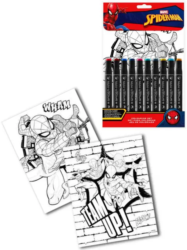 Með 10 tússlitum og 2 myndum af Spiderman til að lita