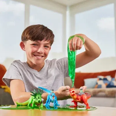 Settu saman risaeðluna sem kemur uppúr slíminu í tilraunaglasinu.